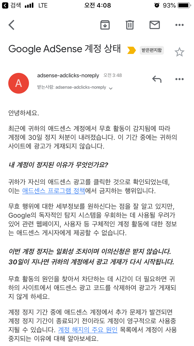 4시 무렵 잠이 오지 않아 몽상을 하고 있는데 구글 에드센스에서 이메일 한통이 왔다. *귀하가 자신의 광고를 클릭한 것으로 확인되었다고 블라블라 30일 동안 계정을 사용할 수 없습니다. 블라블라 * 구글에서 메일을 받고 '헉' 하는 마음이 생겼다. 해킹을 당했는가? 누가 내 에드센스로 장난쳤는가? 하는 마음이 생겼다. 그런데 내가 잘못한 일이더라. 에드센스에서 하는 광고가 궁금해서 몇 번 눌러봤던 사실과 블로그 글을 확인하다가 내가 게시한 광고를 눌러본 탓에 부정클릭으로 정지를 받은 것이다. 그동안 눌러봤던 광고가 부정클릭으로 이렇게 30일 무효처리를 받을지는 꿈에도 생각 못했고 한 달 동안 에드센스를 달기 위해 노력했던 지난 시간이 물거품이 될 것 같다는 부정의 기운이 잠시 나를 찾아왔다.
