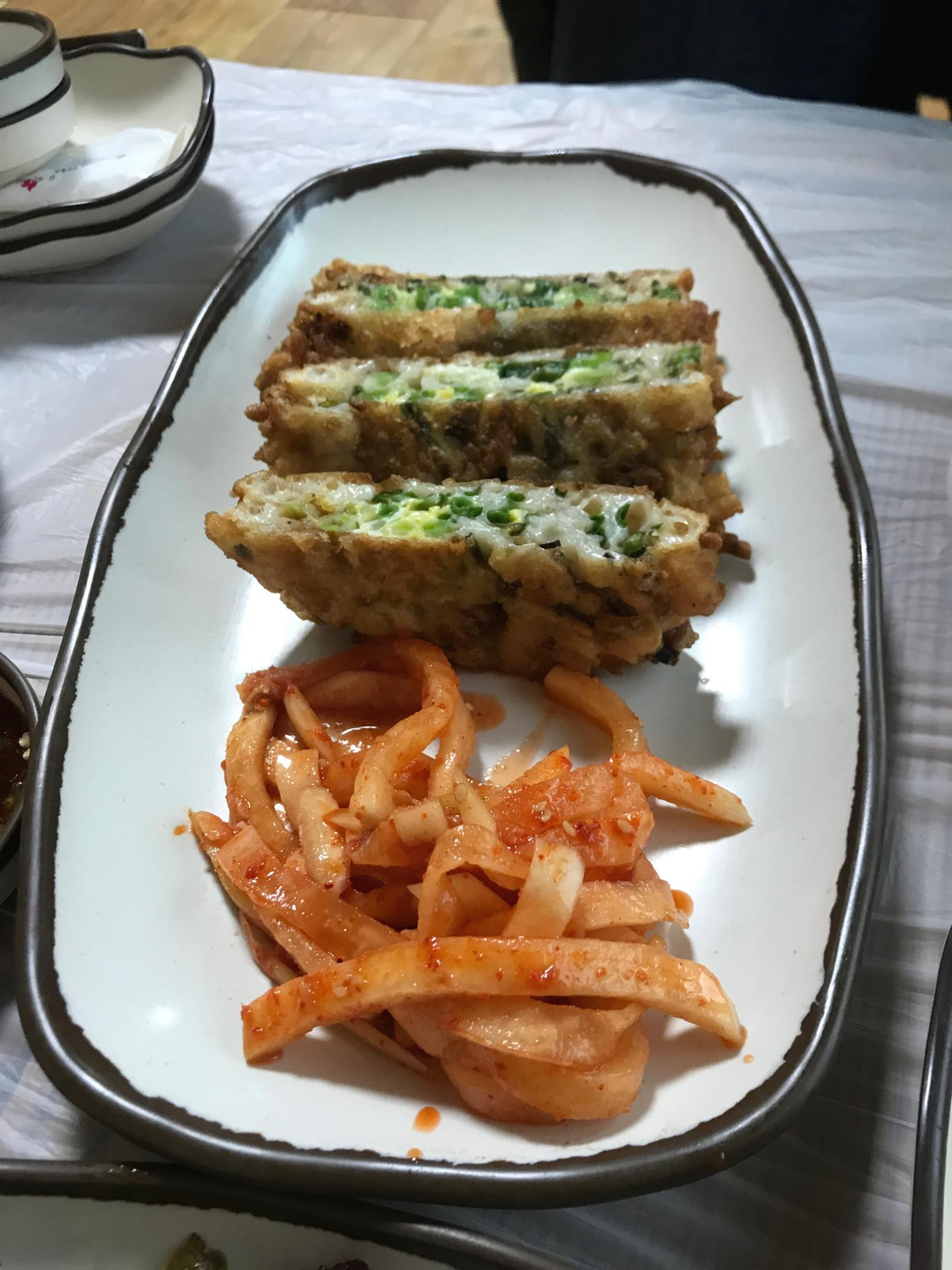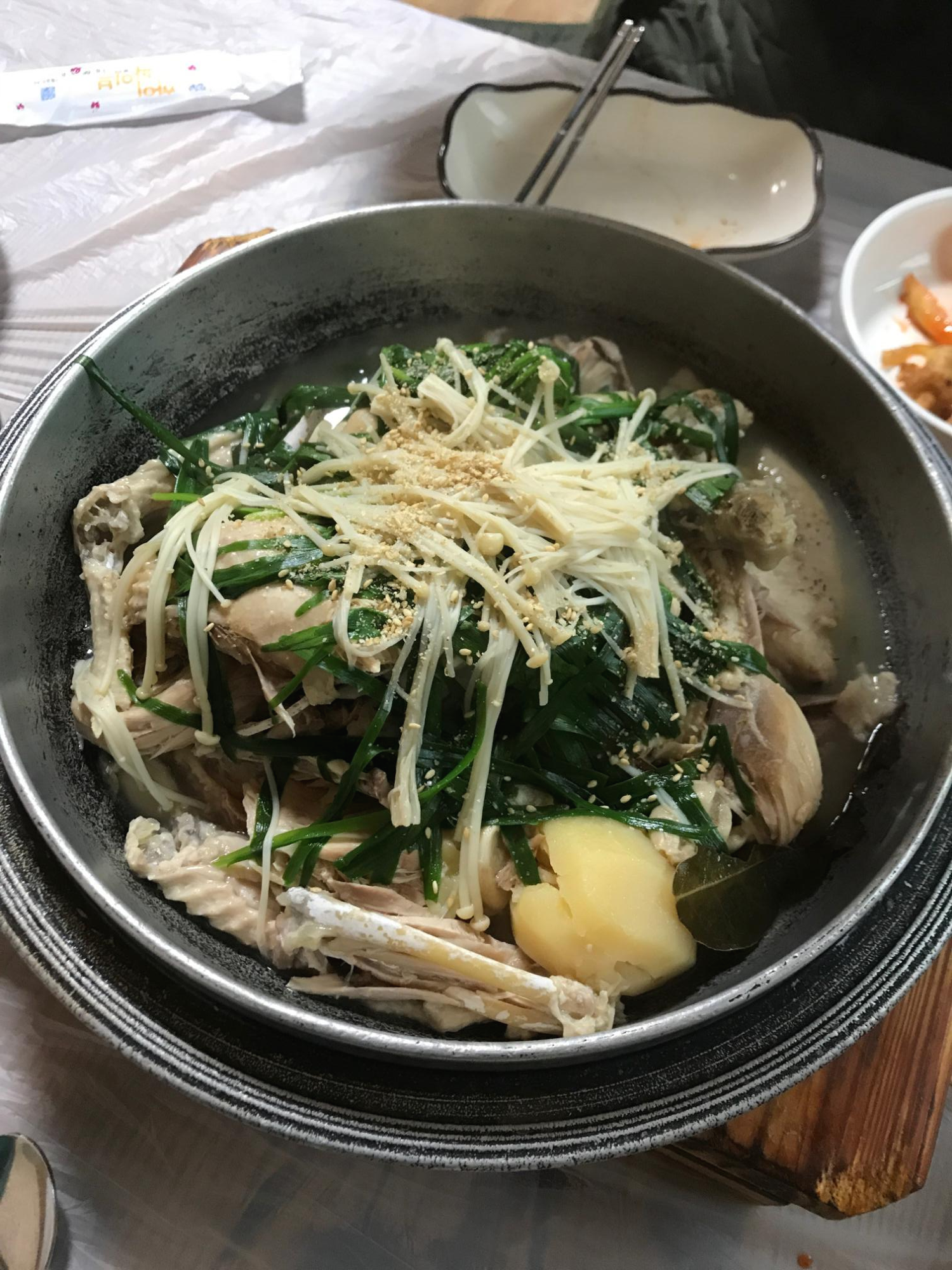 정갈하고 깔끔한 반찬에 눈에 띄는 파전.. 백숙시키면 그냥 줬다. 하지만 백숙다먹고 기본 파전 다 먹고도 한판 더 시켜서 먹어버렸다. 이건 비밀인데 말하고 싶었다. 이런 파전은 살면서 처음이었기에,