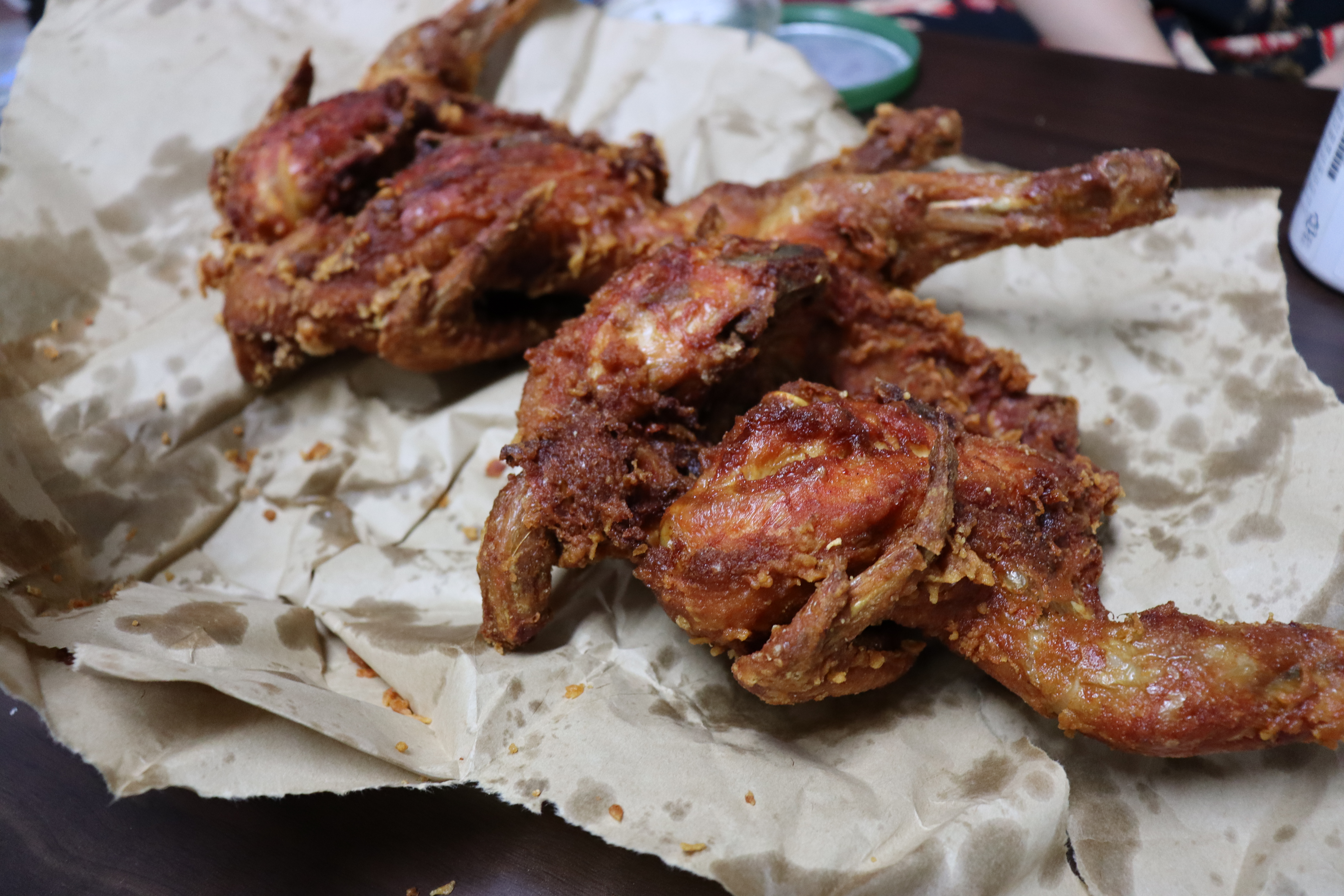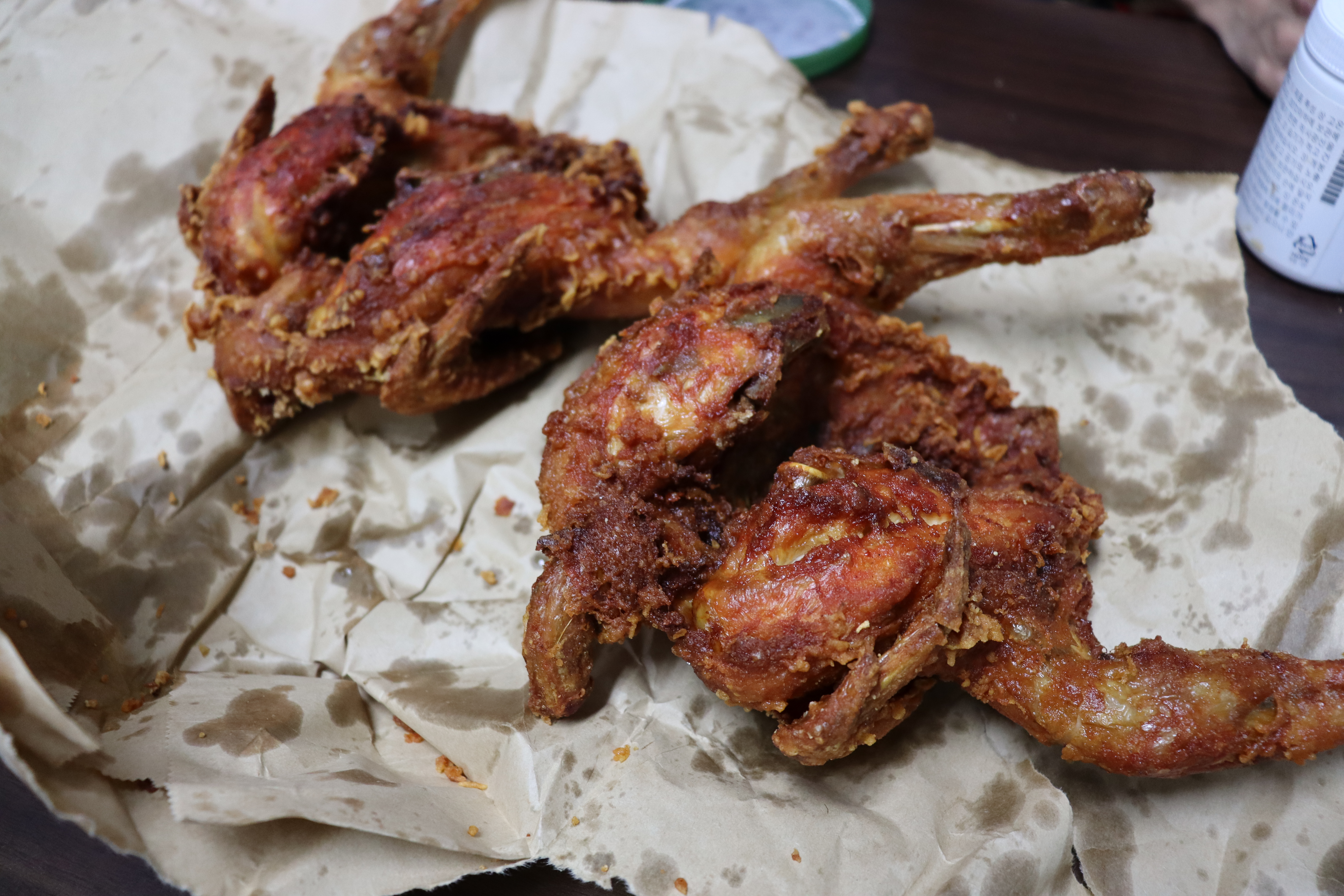 - 이곳은 내가 대구에서 유일하게 찾는 옛날통닭집이다. 처음 나를 옛날통닭의 세계로 빠지게 했던 한 마리 3,500원짜리 경산시장의 옛날통닭을 이을 대구의 옛날통닭집이다. 이쪽 주변에서 일을 시작하고 주변에 있는 수성시장을 거닐다가 한번 컨택을 해놨던 그곳 그러고 몇 달 뒤 길을 지나가다 반신반의 한 마음으로 한번 먹어보고 '음 쏘쏘 하네.'라고 생각하고 안 먹을 줄 알았지만 이상하게 먹은 뒤로 치킨 생각을 하면 자꾸 생각이 나서 7번은 더 먹은 듯하다. 이전에는 옛날 치킨이 먹고 싶으면 경산까지 갔다면 이제는 경산에 갈 수고를 덜어줄 만큼의 가치가 있는 집이다. 매주 월요일은 휴일이니 참고하길 바란다. 이곳의 옛날통닭 포인트는 매콤한 소스를 바르고 그위에 튀김옷을 입혀 색깔이 좀 어두운 거는 사실이지만 두 마리 13,000원이면 밥반찬으로 훌륭하기 짝이 없다.