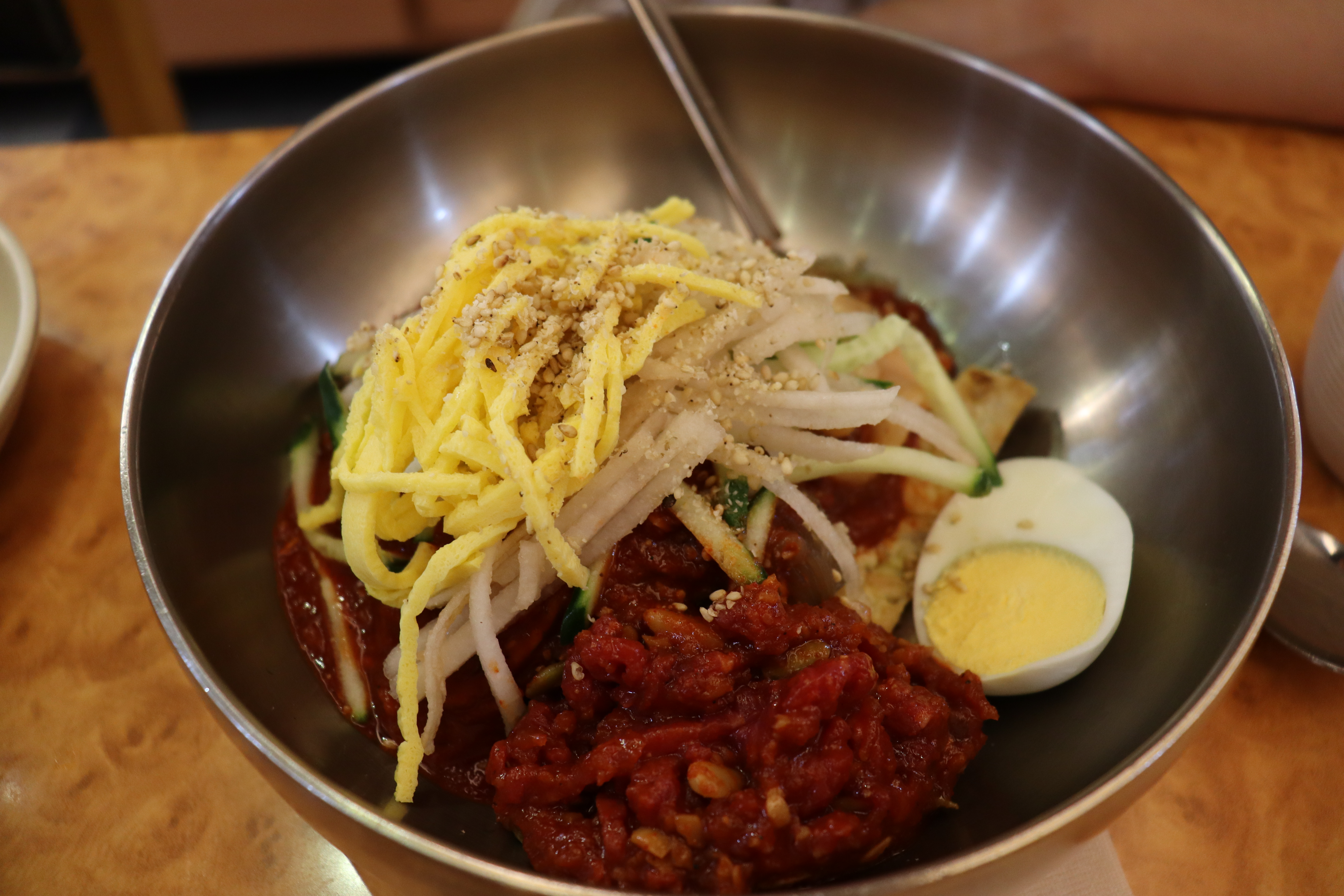 무튼 오늘 우리는 육회 냉면을 먹으러 왔다. 한 그릇 12,000원의 가격에 한주먹의 육회와 맛있는 반찬들을 먹을 수 있다. 냉면 안에는 육전과 육회가 한가득 들어있다. 냉면을 먹기에 충분한 양이다. 이전에는 냉면을 다 먹어도 육회가 남았다면 이번에는 아주 적당했다. 육회의 간도 적당했고, 12,000원에 이런 냉면을 즐길 수 있다는 것에 너무 감사했다. 그리고 고명안에 육전도 아주 넉넉하게 들어있어 먹는 동안 고기의 식감이 나를 행복하게 해 준다.