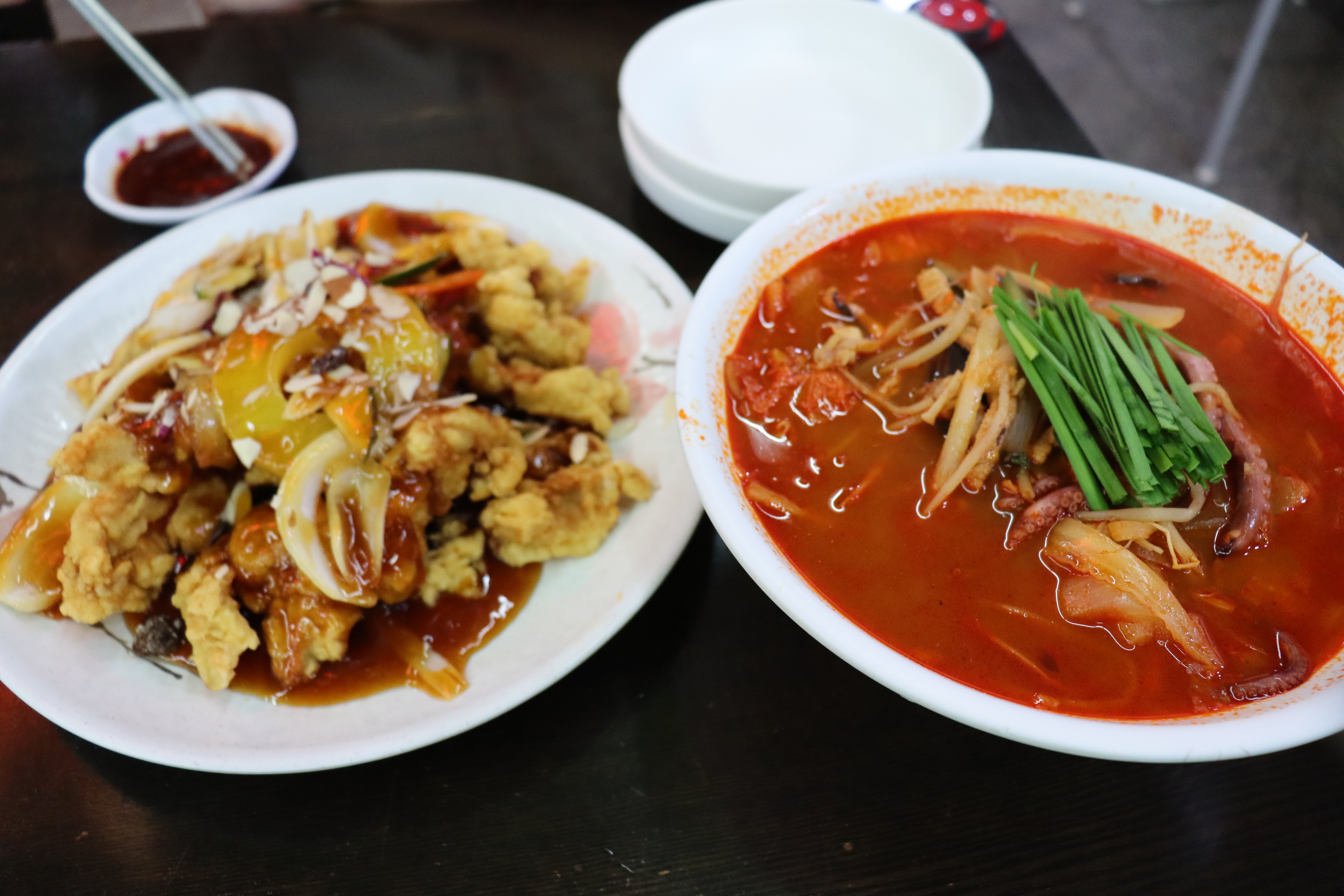 넓은 주차공간에 주린 배를 이끌고 올초에 처음 찾아갔던 집인데,, 볶음밥 먹으러 갔다가 짬뽕 한젓가락 먹고 한그릇 시켜먹은 이후로 아직까지 이 곳에 짬뽕을 먹으러 올지 생각도 못했다. (신신반점 덕분에 짬뽕의 참 맛을 느낌!) 보통 다른 중식집에 가면 한결같이 볶음밥을 먹는 편이라 짬뽕을 먹으러 여기까지 매번 올지 생각도 못했다. 항상 기본적인 음식 가장 좋아한다. 이번에도 기본 짬뽕을 하나 시키고 탕수육도 하나 시켰다. 역시 이 조합은 식사의 완성! 이지 않은가! 이곳은 아주 넓은 식사공간이 있어 밥을 먹으면서도 주변 소음에 식사의 흐름을 뺏기지 않는다는 장점이 있다. 이날은 신신반점에서 먹어보지 않았던 짜장면도 한번 시켜보았다.
